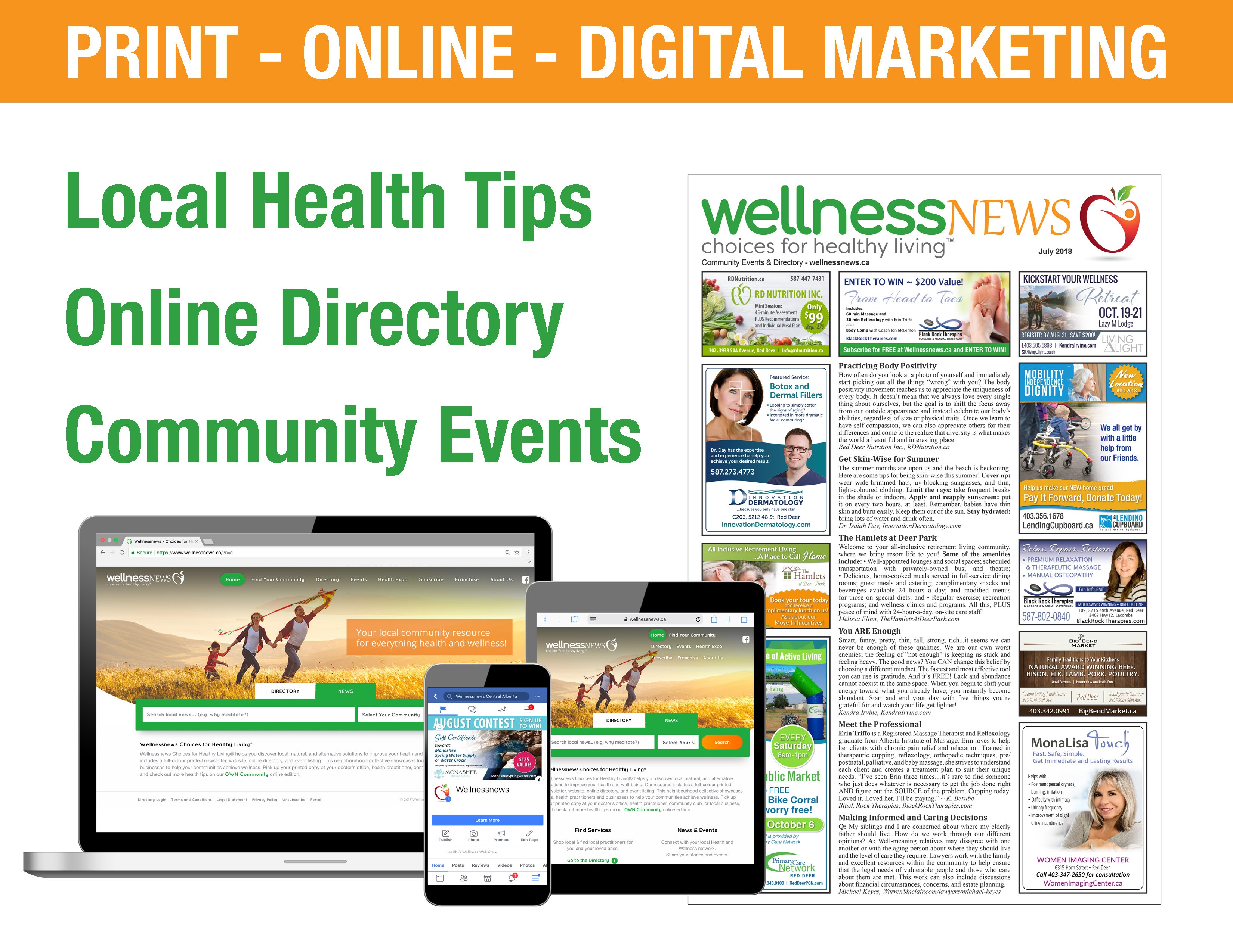 Wellnessnews Choices for Healthy Living® is a multi-media marketing platform that includes print, online, and social media. This proven neighbourhood collective offers an informative resource that showcases professional local health and wellness practitioners and businesses with all-inclusive, industry exclusive campaigns.