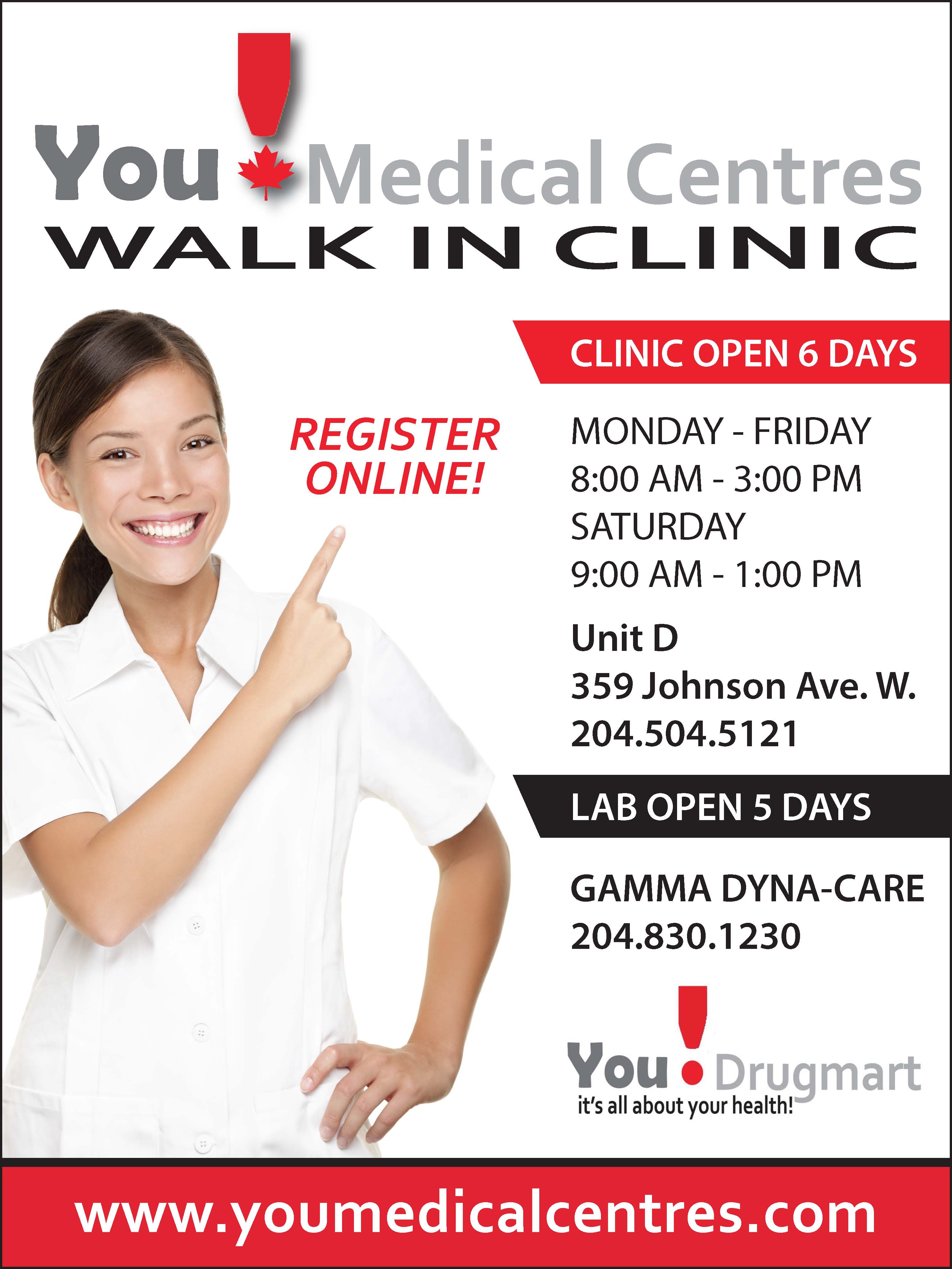 You! Medical Centres Walk In Clinic 359 Johnson Avenue West, Winnipeg, MB, Canada, R2L 0J2 204-981-0534 Get directions Visit website Home ยป You! Medical Centres Walk In Clinic You! Medical Centres Walk In Clinic Facebook: https://www.facebook.com/pages/You-Medical-Centres/638717509526252